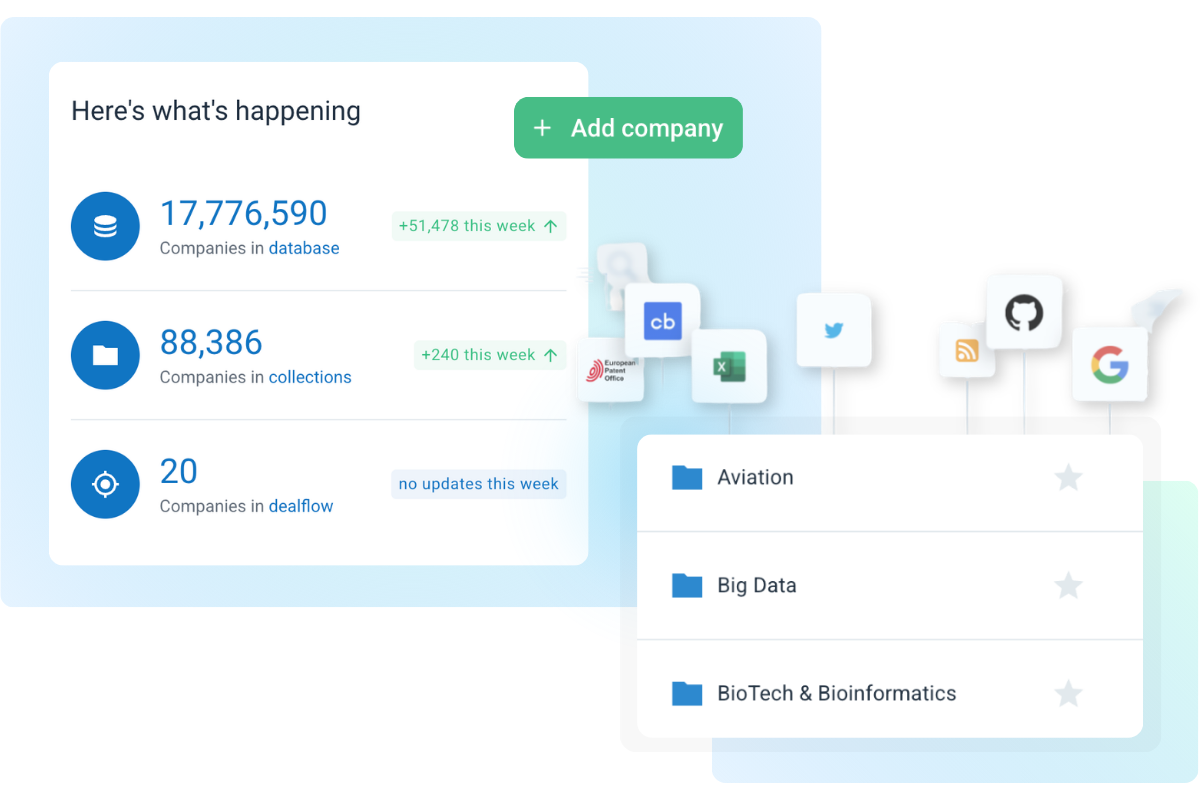 Our database is built from a wide range of data sources, including company websites, Google, financial databases, patent offices, news outlets, LinkedIn, and more.
